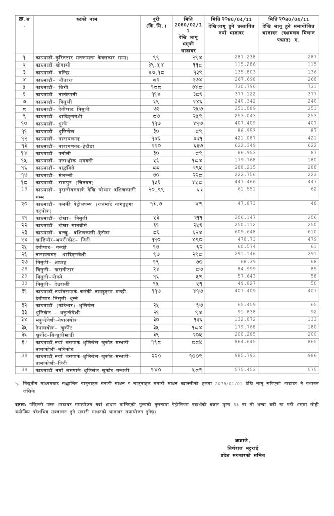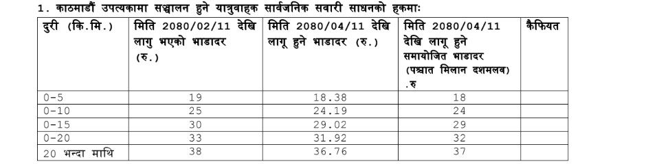 नयाँ भाडादरअनुसार काठमाडौं उपत्यकाभित्रका सार्वजनिक सवारीसाधनको भाडा एक रुपैयाँले घटेको छ । नयाँ भाडादर अनुसार सार्वजनिक बसमा शून्यदेखि पाँच किलोमिटरसम्म यात्रा गर्दा अब १८ रुपैयाँ भाडा तोकिएको छ ।