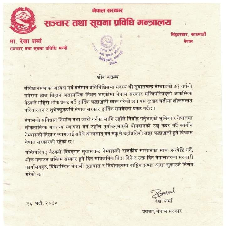 सुवासचन्द्र नेम्वाङको राजकीय सम्मानका साथ अन्त्येष्टि गरिने भएको छ ।मंगलवार बसेको आकस्मिक बैठकले राजकीय सम्मानका साथ उनको अन्त्येष्टि गर्दै सोही दिन सार्वजनिक बिदा दिने निर्णय पनि गरेको छ । छोराहरू विदेशबाट आइसकेपछि जुन दिन अन्त्येष्टि हुन्छ त्यसै दिन सार्वजनिक बिदा दिइने निर्णय भएको संस्कृति पर्यटन तथा नागरिक उड्डयन मन्त्री सुदन किरातीले बताएको छन्।