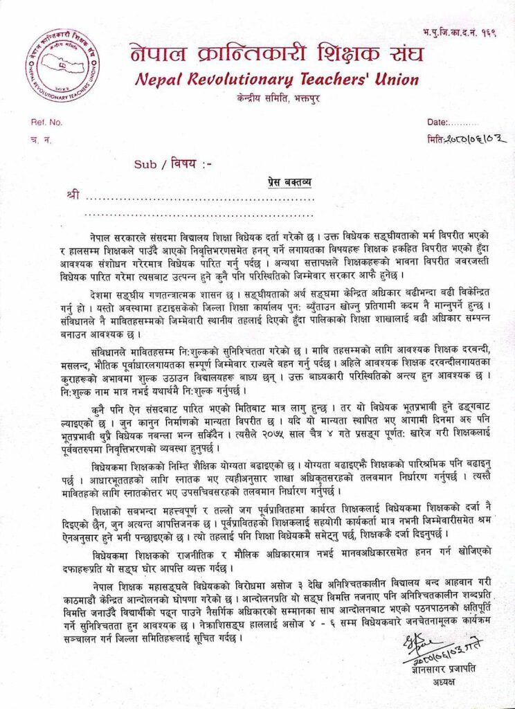 असोज ४, नेपाल क्रान्तिकारी शिक्षक सङ्घ केन्द्रीय समितिले बुधबार एक प्रेस विज्ञप्ति प्रकाशित गरी नेपाल सरकारद्वारा संसद्मा प्रस्तुत विद्यालय शिक्षा विधेयक आवश्यक परिमार्जन गरेरमात्र पारित गर्न माग गरेको छ । केन्द्रीय अध्यक्ष ज्ञानसागर प्रजापतिद्वारा हस्ताक्षरित उक्त विज्ञप्तिमा भनिएको छ- विधेयक सङ्घीयताको मर्मविपरीत भएको र हालसम्म शिक्षकले पाउँदै आएको निवृत्तिभरण समेत हनन गर्नेलगायत विषयहरू शिक्षक हक हितविपरीत भएको हुँदा आवश्यक संशोधन गरेरमात्र विधेयक पारित गर्नुपर्छ ।