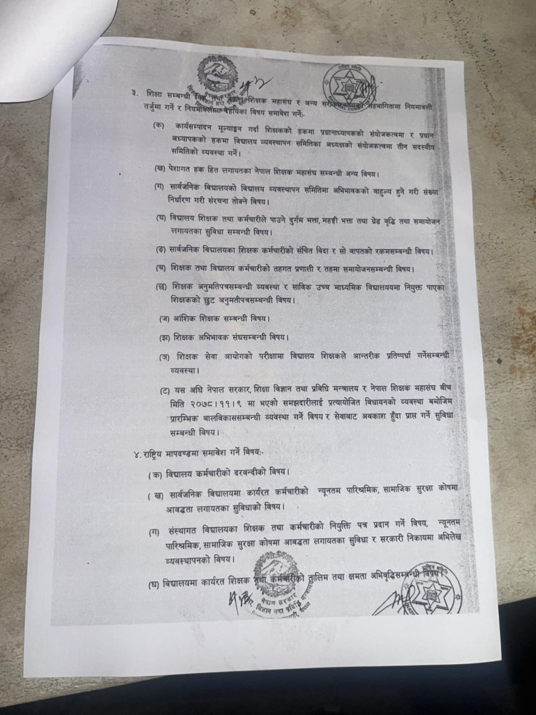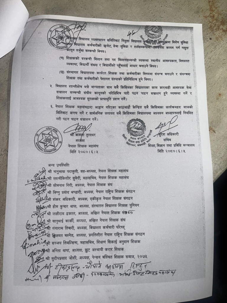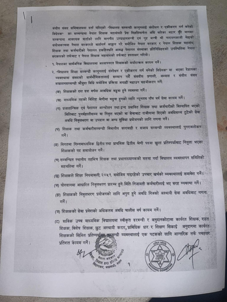 शिक्षा सरकार र शिक्षक महासंघबीच ६ बुँदे सहमति, शिक्षकका आन्दोलन स्थगित (सहमती पत्र सहित) 0 142 Facebook Twitter Pinterest WhatsApp यो खबर पढेर तपाईलाई कस्तो महसुस भयो ? +1 0 +1 0 +1 0 +1 0 +1 0