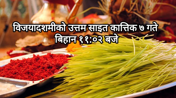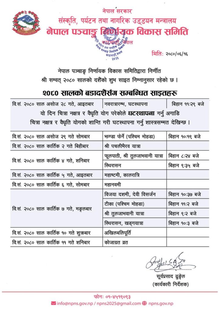 यससँगै नेपाल पञ्चाङ्ग निर्णायक विकास समितिद्वारा निर्णीत २०८० सालको दशैंको शुभ साइतहरु निम्न रहेको छ।