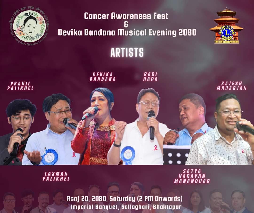 असोज १७, दिक्षा गौरी हाडा स्मृति प्रतिष्ठान र लायन्स क्लव अफ भक्तपुर भैरवको संयुक्त आयोजनामा हुने क्यान्सर सचेतना महोत्सव तथा गायिका देविका बन्दना सांगीतिक साँझ २०८० कार्यक्रम हुने भएको छ । यहि असोज २० गते शनिबार दिनको २ बजे Imperial Banquet मा महोत्सव हुन लागेको हो । महोत्सवमा गायिका देविका बन्दनाको मुख्य प्रस्तुति रहेको छ भने अन्य गायक गायिकाहरुले पनि आफ्ना गीत प्रस्तुत गर्ने कार्यक्रम रहेको छ । साथै नृत्य र Food Stall हरु पनि रहने आयोजक समितिले जानकारी दिएको छ ।