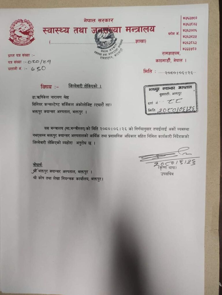 असोज २६ गते, भक्तपुर । स्वास्थ्य तथा जनसंख्या मन्त्रालय (मा. मन्त्रीस्तर) को मिति २०८०।०६।२६ को निर्णयानुसार भक्तपुर क्यान्सर अस्पतालको आर्थिक तथा प्रशासनिक अधिकार सहित प्रा. डा. ऋषिकेश नारायण श्रेष्ठ निमित्त कार्यकारी निर्देशकको पदबहाली बहालि भएको छ । मन्त्रालयको मिति २०८०।०६।२६ गतेको निर्णयानुसार भक्तपुर क्यान्सर अस्पतालमा प्रा. डा. ऋषिकेश नारायण श्रेष्ठद्वारा निमित्त कार्यकारी निर्देशकको पदबहाली गरेको पत्रमा उल्लेख छ ।