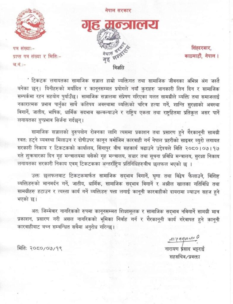 सामाजिक सञ्जालको दुरुपयोग रोक्नका लागि त्यसमा प्रकाशन तथा प्रसारण हुने गैरकानूनी सामग्री स्वतः हट्ने व्यवस्था मिलाउन र दोषीउपर कानून बमोजिम कारबाही गर्न नेपाल प्रहरीको साइवर व्युरो लगायत सरकारी निकाय र टिकटकको कार्यालय, सिंगापुर बीच सहकार्य बढाउने उद्देश्यले मिति २०८०।०७।१७ शुक्रबारका दिन गृह मन्त्रालयमा बसेको गृह मन्त्रालय, सञ्चार तथा सूचना प्रविधि मन्त्रालय, सुरक्षा निकाय लगायतका सरकारी निकाय एवम् टिकटकका अन्तर्राष्ट्रिय प्रतिनिधिहरुबीच छलफल भएको छ ।