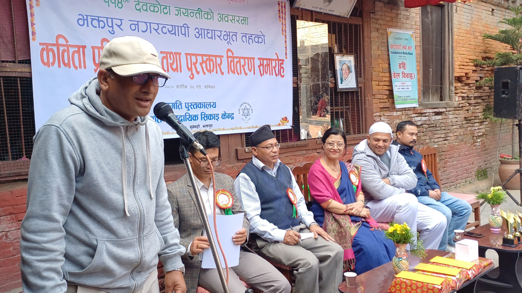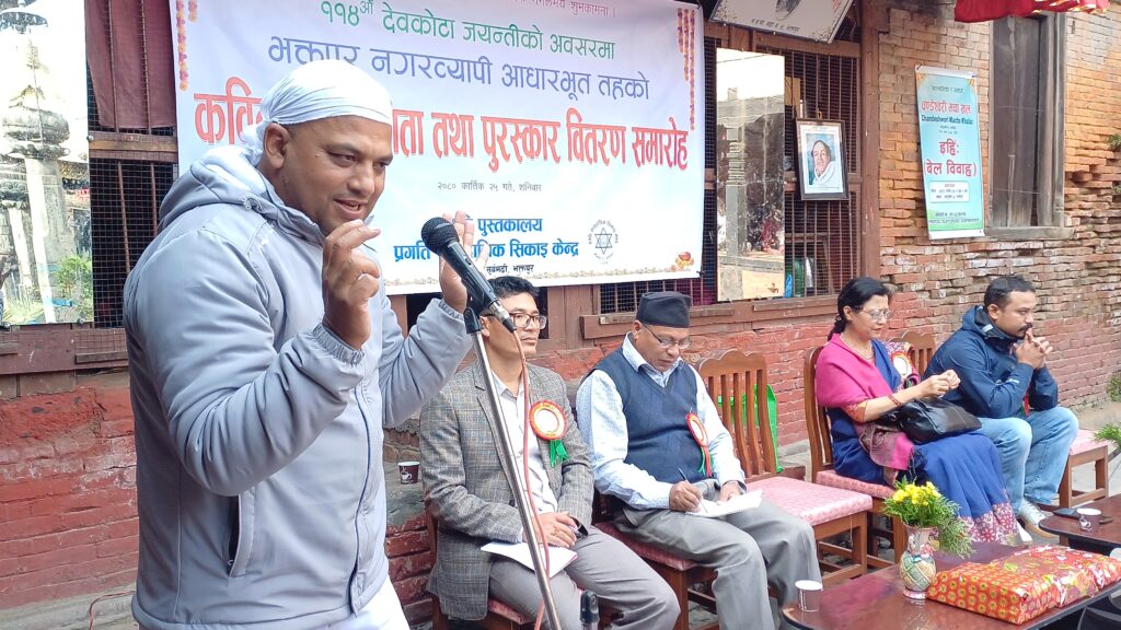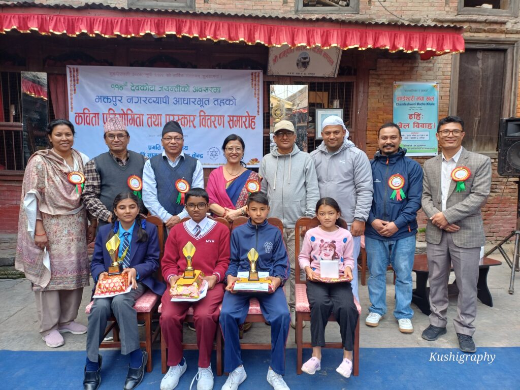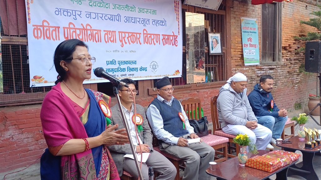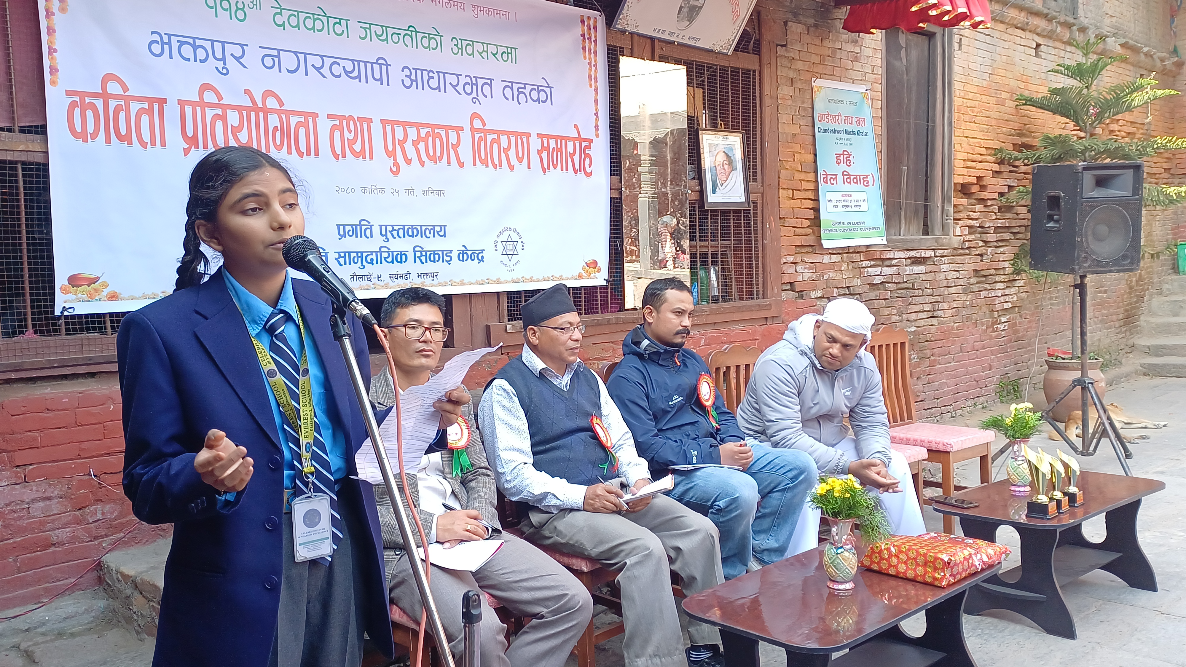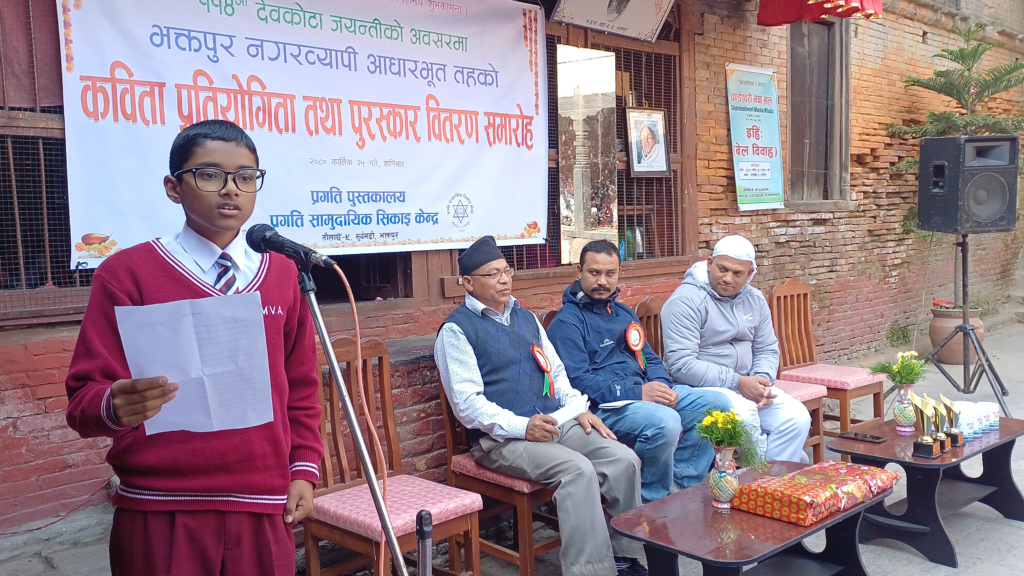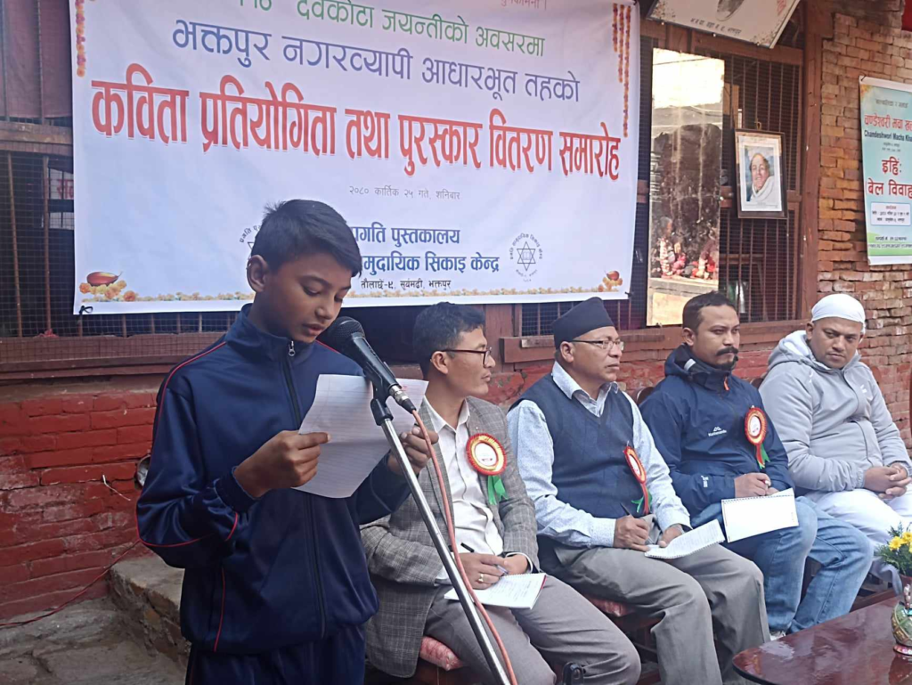 कार्तिक २५, भक्तपुर । । प्रगति पुस्तकालय र प्रगति सामुदायिक सिकाइ केन्द्रको संयुक्त आयोजनामा समाज परिवर्तनका लागि साहित्य भन्ने मूल उद्देश्यका साथ ११४ औं महाकवि लक्ष्मीप्रसाद देवकोटा जयन्तीको अवसरमा भक्तपुर नगरव्यापी आधारभूत तहको कविता प्रतियोगिता शनिबार सम्पन्न भयो ।