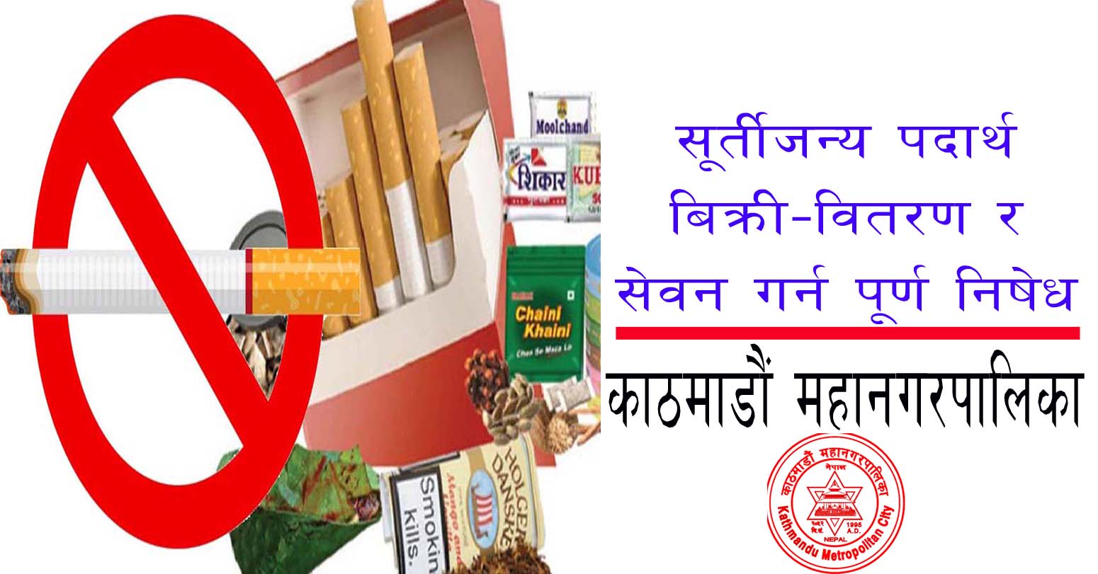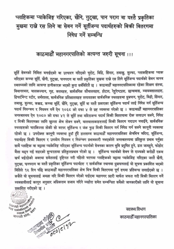 सूचनामा भनिएकाे छ—सेवनका निमित्त बनाइएका वा उत्पादन गरिएका (चुरोट, विँडी, सिंगार, तमाखु, सुल्फा, कक्कड, प्लाष्टिकमा प्याक गरिएका कच्चा सूर्ती, खैनी, गुट्खा, पानपराग वा यस्तै प्रकृतिका मुखमा राखेर रस लिने) सूर्तीजन्य पदार्थको भण्डारण, बिक्री र प्रयोगमा रोक लगाउने र कसैले बिक्री गरेको देखे नगर प्रहरीले सामान जफत गर्नेछ।