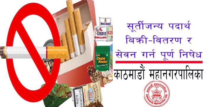 काठमाडौं- आगामी २७ मंसिरदेखि काठमाडौं महानगरपालिका भित्र सूर्तिजन्य पदार्थको बिक्री, भण्डारण तथा प्रयोगलाई पूर्ण रुपमा निषेध गरिने भएको छ। मंगलबार स्वास्थ्य विभागले सार्वजनिक सूचना जारी गर्दै १५ दिनपछि यो व्यवस्था लागू हुने जनाइएको छ।