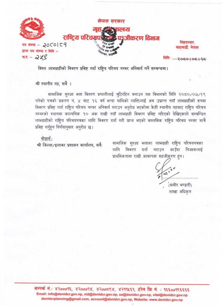 गृह मन्त्रालयअन्तर्गतको राष्ट्रिय परिचय तथा पञ्जीकरण विभागले साेमबार एक सूचना जारी गर्दै यस्तो निर्णय भएको जनाएको हो ।