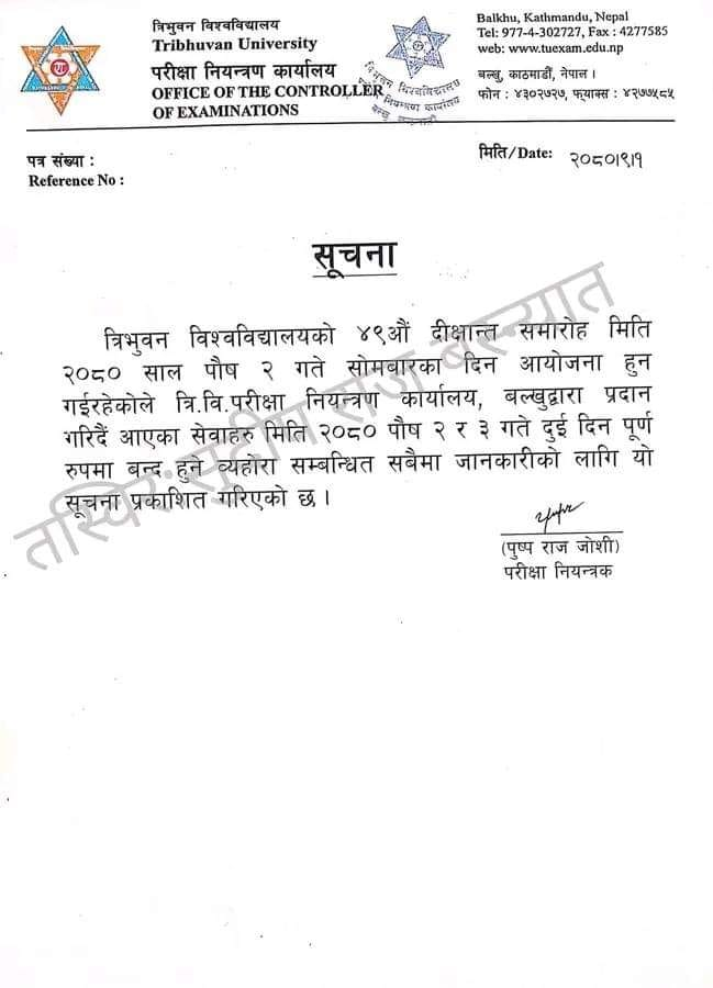 ‘त्रिभुवन विश्वविद्यालयको ४९औं दीक्षान्त समारोह मिति २०८० साल पौष २ गते सोमबारका दिन आयोजना हुन गईरहेकाले त्रिवि परीक्षा नियन्त्रण कार्यालय, बल्खुद्वारा प्रदान गरिँदै आएका सेवाहरु मिति २०८० पौष २ र ३ गते दुई दिन पूर्ण रुपमा बन्द हुने व्यहोरा सम्बन्धित सबैमा जानकारीको लागि यो सूचना प्रकाशित गरिएको छ,’सूचनामा उल्लेख छ।