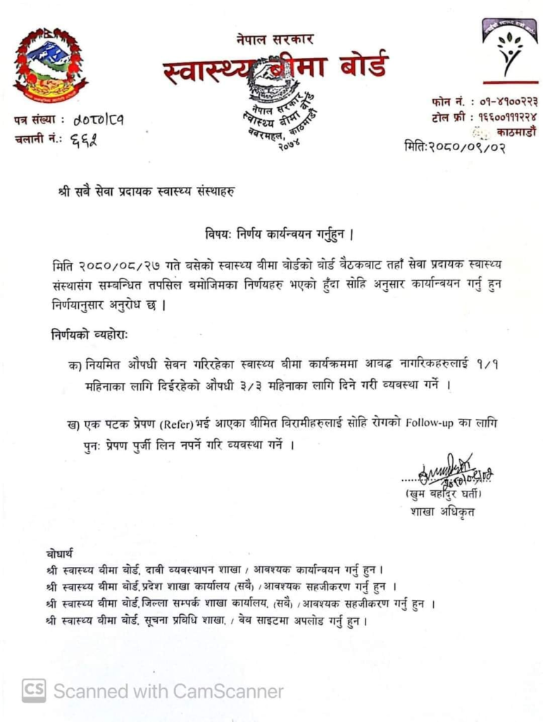 मिति २०८० पुष २ गते प्रकाशित बोर्डकाे पत्रअनुसार सबै सेवा प्रदायक स्वास्थ्य सस्थाहरुलाइ साेही बमाेजिम कार्यान्वयन गर्न समेत अनुराेध गरेकाे छ ।
