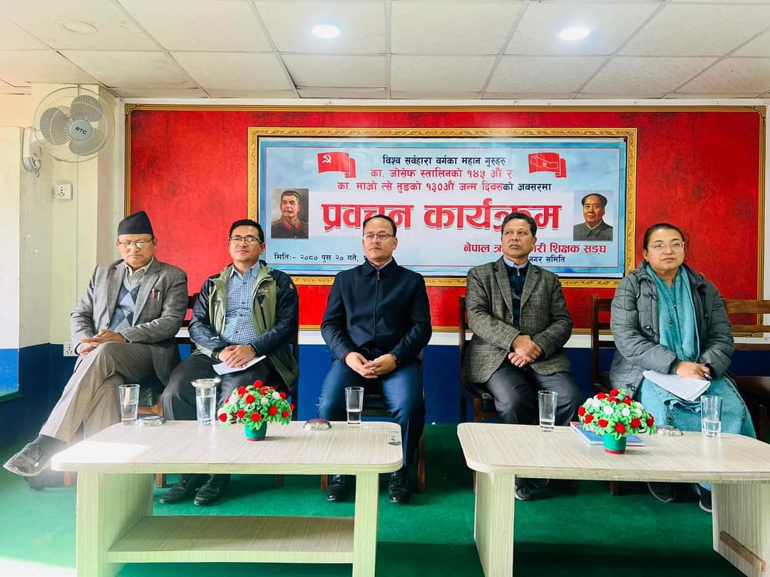 भक्तपुर, पुष २०। नेपाल क्रान्तिकारी शिक्षक संघ भक्तपुर जिल्ला तथा नगर समितिको संयुक्त आयोजनामा गणेश माविमा जोसेफ स्तालिनको १४५ अाैं र माउत्से तुङको १३० अाैं जन्म दिवसको अवसरमा स्मरण प्रवचन सम्पन्न भयो ।