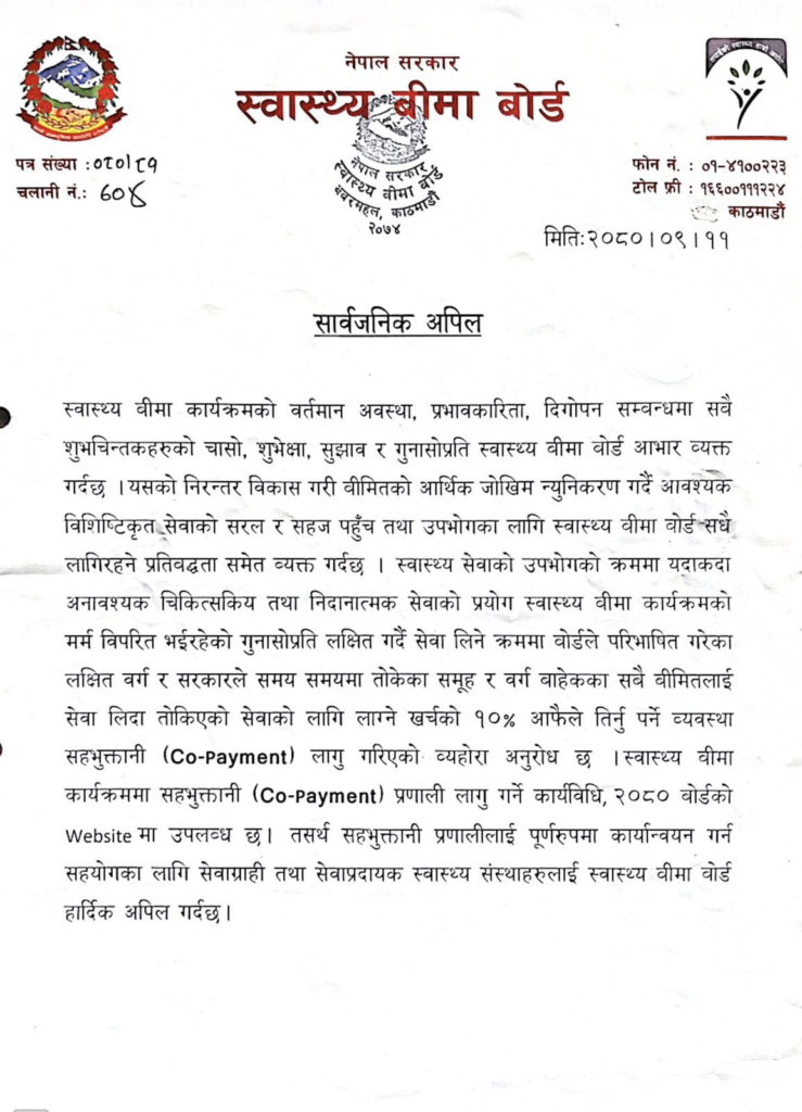 समाचारस्वास्थ्य माघ १ गतेदेखि स्वास्थ्य बिमाको १० प्रतिशत पैसा तिर्नुपर्ने 0 107 Facebook Twitter Pinterest WhatsApp स्वास्थ्य बिमा बोर्डले स्वास्थ्य बिमा कार्यक्रममा लिएको नयाँ नीति माघ १ गतदेखि लागु हुने स्वास्थ्य बिमा बोर्डले जनाएको छ। यो खबर पढेर तपाईलाई कस्तो महसुस भयो ? +1 0 +1 0 +1 0 +1 0 +1 0