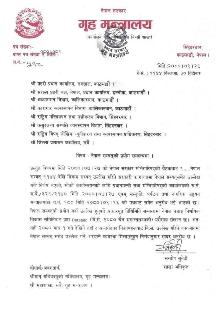 माघ १, भक्तपुर । नेपाल सरकार, गृह मन्त्रालयले नेपालमा प्रचलित नेपालको मौलिक राष्ट्रिय सम्वत् नेपाल सम्वत सरकारी कार्यालयहरुमा प्रयोग गर्न पत्राचार गरेको छ । मन्त्रिपरिषद्को बैठकबाट सम्वत् ११४४ देखि विक्रम सम्वत् उल्लेख गरिने सरकारी कागजातमा नेपाल सम्वत् समेत उल्लेख गर्ने निर्णय भएको पत्रमा उल्लेख छ