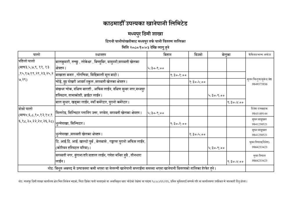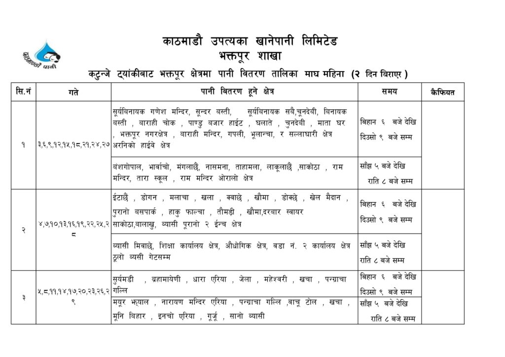यस्ताे छ भक्तपुरमा आउने मेलम्चीकाे पानी वितरण तालिका
