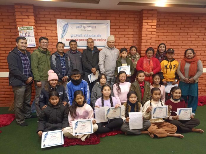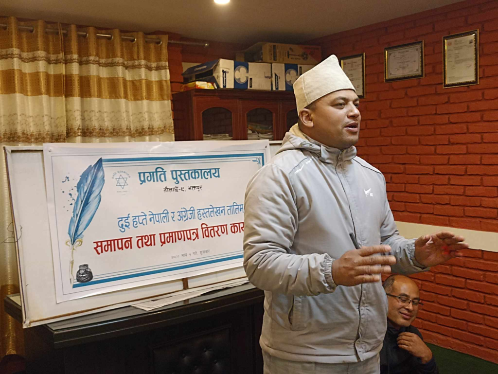 माघ ५, भक्तपुर । प्रगति पुस्तकालयको आयोजनामा दुई हप्ते नेपाली र अङ्ग्रेजी हस्तलेखन तालिम समापन तथा प्रमाणपत्र वितरण कार्यक्रम सप्पन्न भयो ।