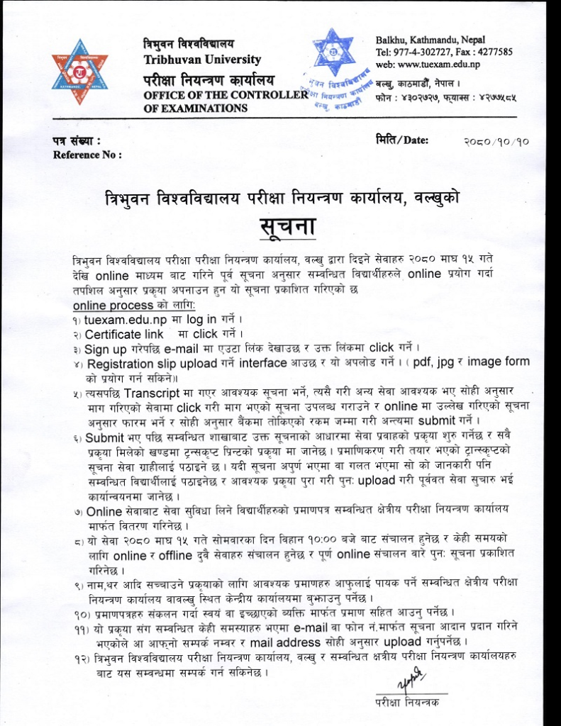 अनलाइन प्रक्रियाका लागि tuexam.edu.np मा लगइन गरी सर्टिफिकेट लिङ्कमा क्लिक गरेपछि साइन अप गर्नुपर्छ। त्यसपछि सेवाग्राहीले कार्यालयले मागे सूचना विवरण उपलब्ध गराउनुपर्ने छ ।