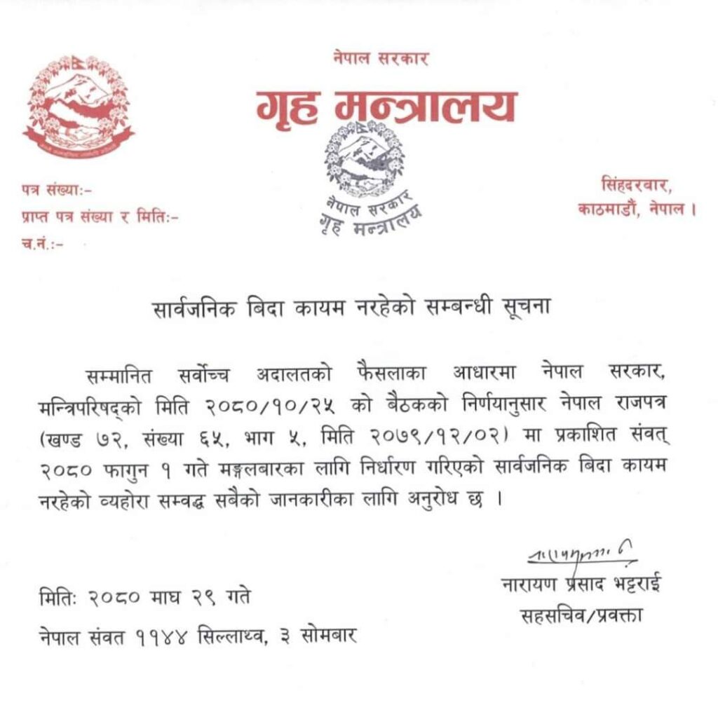 मन्त्रालयले जारी गरेको सूचनामा भनिएको छ ‘सम्मानित सर्वोच्च अदालतको फैसलाका आधारमा नेपाल सरकार, मन्त्रिपरिषद्को मिति २०८०/१०/२५ को बैठकको निर्णयानुसार नेपाल राजपत्र (खण्ड ७२, संख्या ६५, भाग ५ मिति २०७९/१२/०२) मा प्रकाशित संवत् २०८० फागुन १ गते मङ्गलबारका लागि निर्धारण गरिएको सार्वजनिक बिदा कायम नरहेको व्यहोरा सम्वद्ध सबैको जानकारीका लागि अनुरोध छ ।’