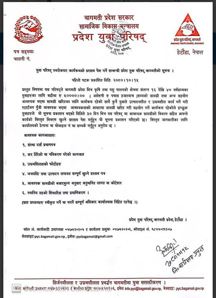 प्रदेश युवा परिषद्ले बागमती प्रदेश भित्र कृषि तथा पशु पालनको क्षेत्रमा संलग्न १६ देखि ४० वर्षसम्मका युवाहरुका लागि बढीमा रु ५००००।०० (अक्षेरुपी रु पचास हजारमात्र सम्मको सामग्री तथा अन्य आवश्यक सहयोग गर्ने भएकाे छ ।