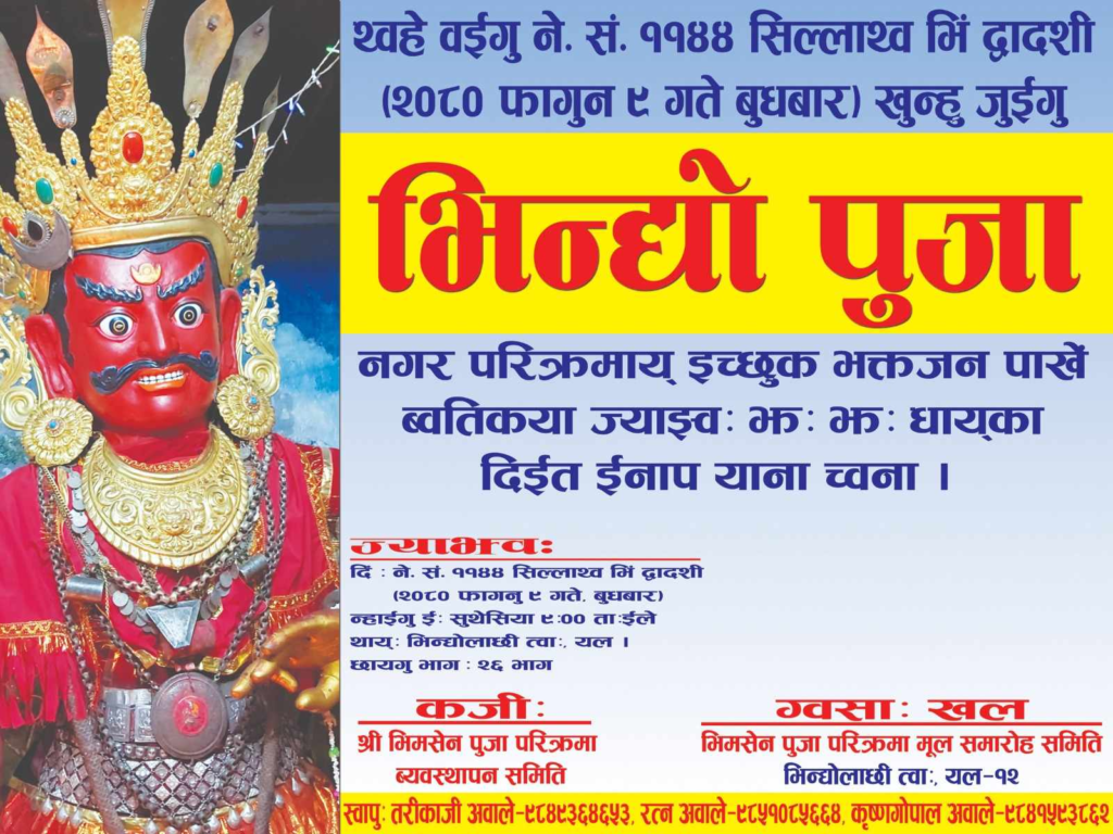 फागुन ९, ललितपुर । पाटनमा भिमसेन(भिन्द्यो)पुजा, १० बर्ष पछि भिन्द्योलाछीको आयोजनामा यहि फागुन ९ गते बुधबार ललितपुरको भिन्द्योलाछि(पतकोलाछि) टोलमा भिन्द्यो पूजा (भिमसेन पूजा) हुने भएको छ । परिक्रमा समारोह भिन्द्योलाछि(पतकोलाछि)को आयोजनामा भिन्द्यो लाछि टोल कमिटीका सदस्य रुपेश अवालेले उक्त कुरा बताउनुभएको हो ।उक्त पुजा परिक्रमामा करिब ९ वटा टोलको सहभागि रहने र अन्दाजी २५०० देखि ३००० सङ्ख्यामा भक्तजनको सहभागि हुने अनुमान गरिएको छ ।