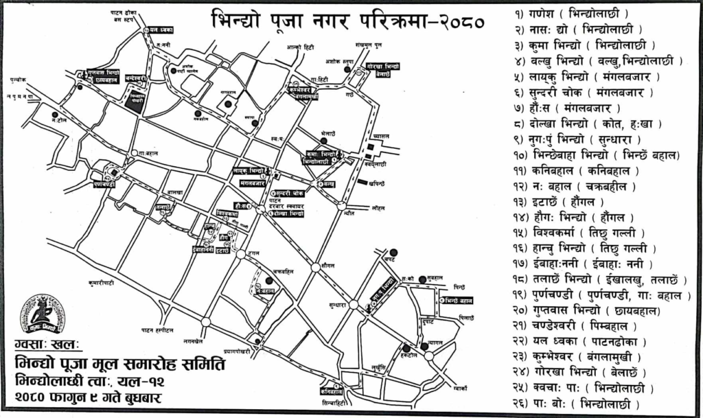 वि.स. २०७० साल देखि ललितपुर विकास समाजका तत्कालिन अध्यक्ष बुद्धिराज बज्राचार्यबाट हरेक बर्ष भिन्द्यो पूजा परिक्रमाका लागि ब्यवस्थापन समिति गठन भएको थियो। समितिको निर्णय अनुसार प्रत्येक वर्ष पूजाका लागि क्रमबद्द रुपमा पालै पालो निम्न टोलहरुद्वारा ब्यवस्थापन हुँदै आएको छ। १.भिन्धोलाछि २. नगत्त्वा ३. हौग त्वा ४. कोन्ति ५. कनिबहा ६. छाय् बाहा ७. कोत-मंगः हखा ८. भिन्छेंबहा ९. मंग १०. तलाछें इखालख