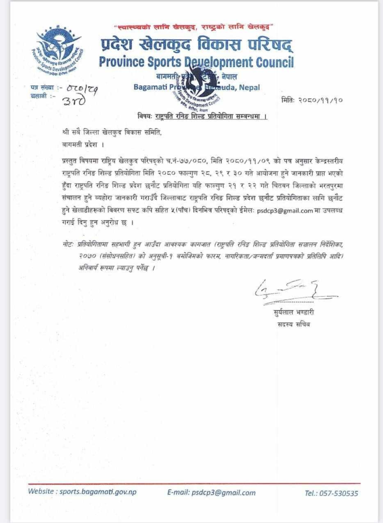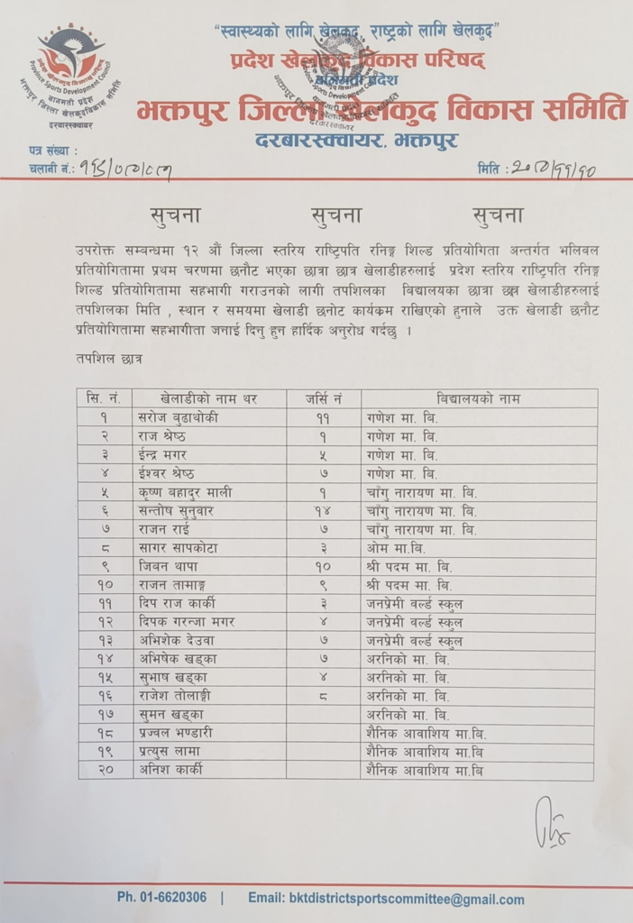 फागुण ११, भक्तपुर । जिल्ला खेलकुद बिकास समिति भक्तपुरले वागमति प्रदेश स्तरीय राष्ट्रपति रनिङ्ग शिल्ड प्रतियोगिताका लागि खेलाडी छनौटको प्रक्रिया सुरु गरेको छ । समितिले एक सूचना जारी गर्दै १२ औं जिल्ला स्तरीय राष्ट्रपति रनिङ्ग शिल्ड प्रतियोगिता अन्तर्गत भलिबल प्रतियोगितामा प्रथम चरणमा छनौट भएका छात्र छात्रा खेलाडीलाई सहभागिताका लागि आहवान गरेको छ ।