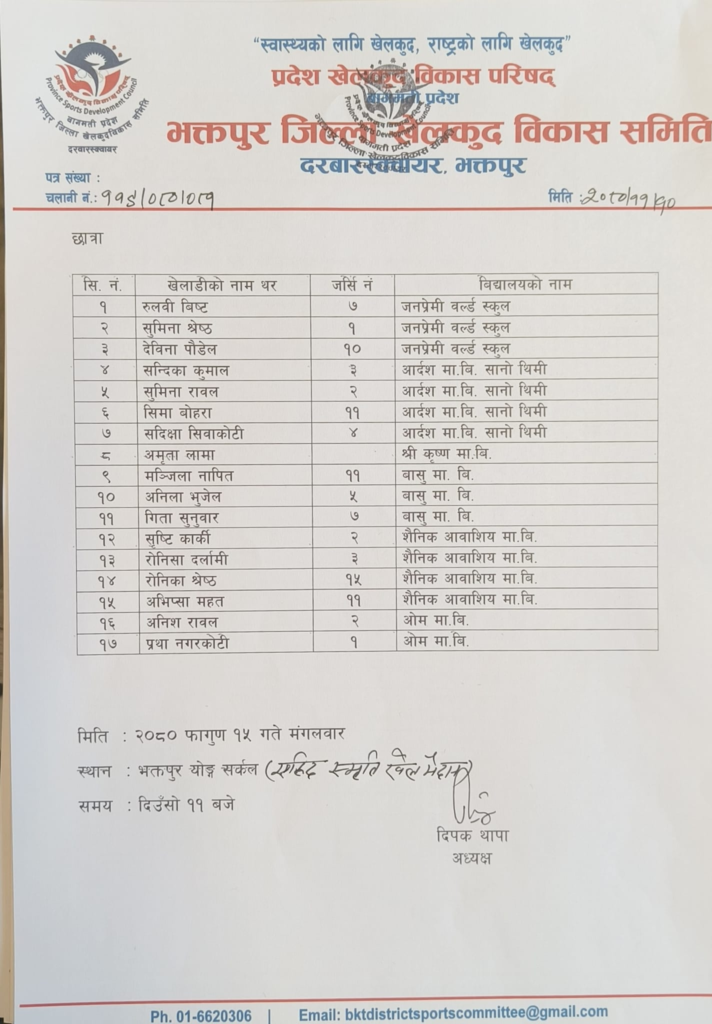 फागुन १५ गते शहिद स्मृति खेल मैदानमा दिउँसो ११ बजे खेलाडी छनौट हुने