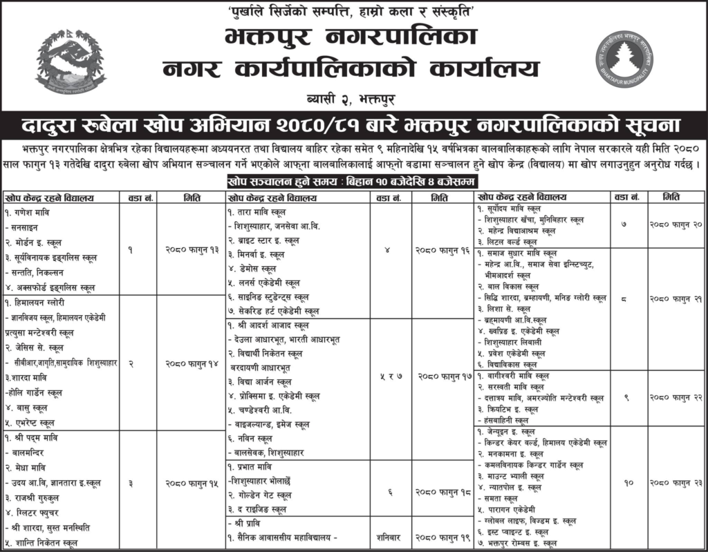 अभियानको क्रममा भक्तपुर नगरपालिकाले फागुन १३ गतेदेखि २३ सम्म नगरपालिका क्षेत्रभित्र रहेका विद्यालयहरूमा अध्ययनरत तथा विद्यालय बाहिर रहेका समेत बालबालिकाहरुको लागि खोप केन्द्र (विद्यालय) मार्फत दादुरा रुबेला विरुद्धको खोप दिइने तालिका सार्वजनिक गरेको छ ।