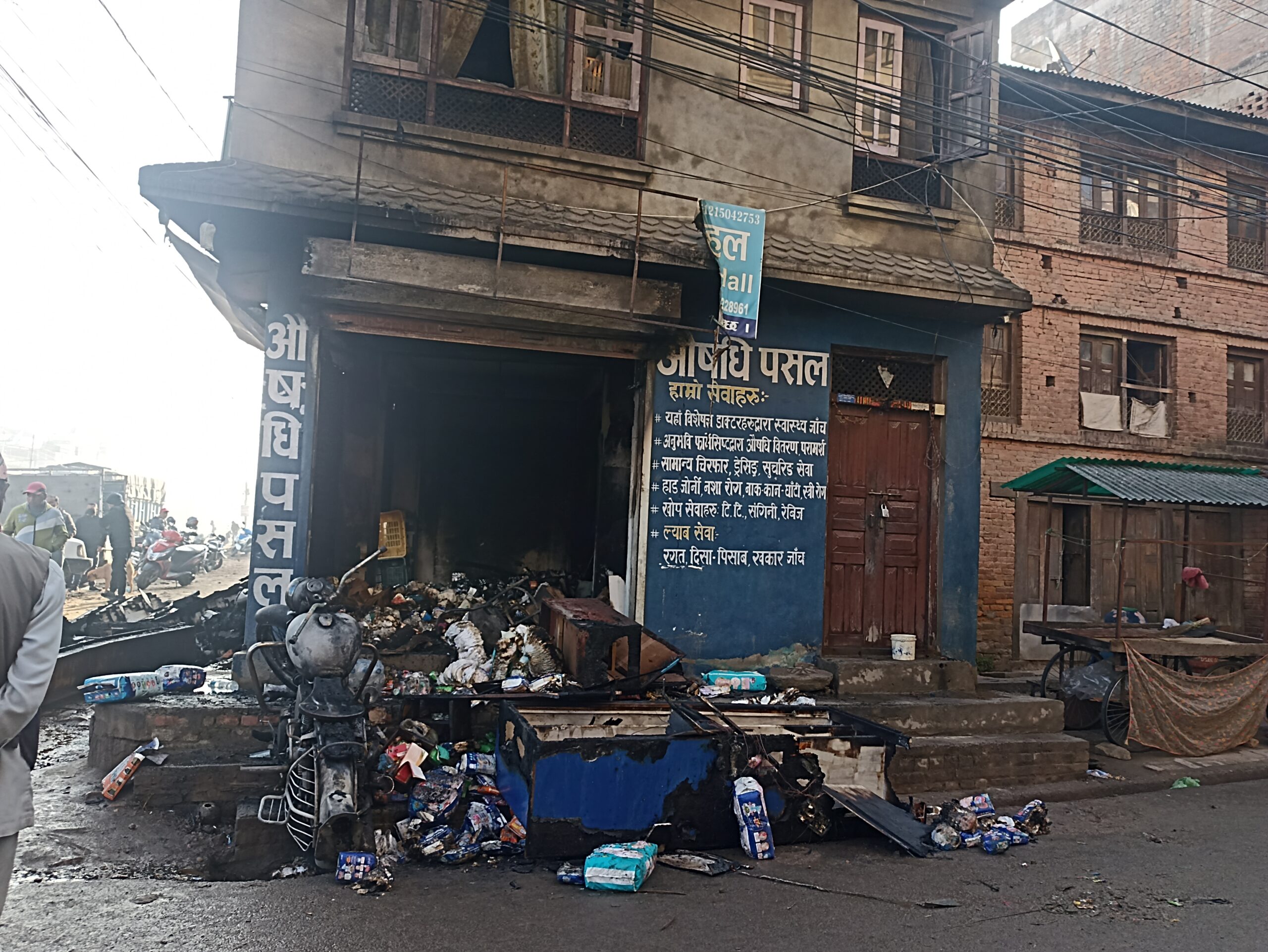 फागुन २२, भक्तपुर । भक्तपुरको आदर्श बस स्टप नजिकै एक औषधि पसलमा आज बिहान आगलागी भएको छ । आगलागीका कारण औषधि पसलमा रहेका सबै सामग्रीहरु नष्ट भएको छ भने बुलेट बाईक र स्कुटर पनि पुर्ण क्षति भएको छ । आगलागी कसरी भएको भन्ने जानकारी प्राप्त हुन बाकी छ ।