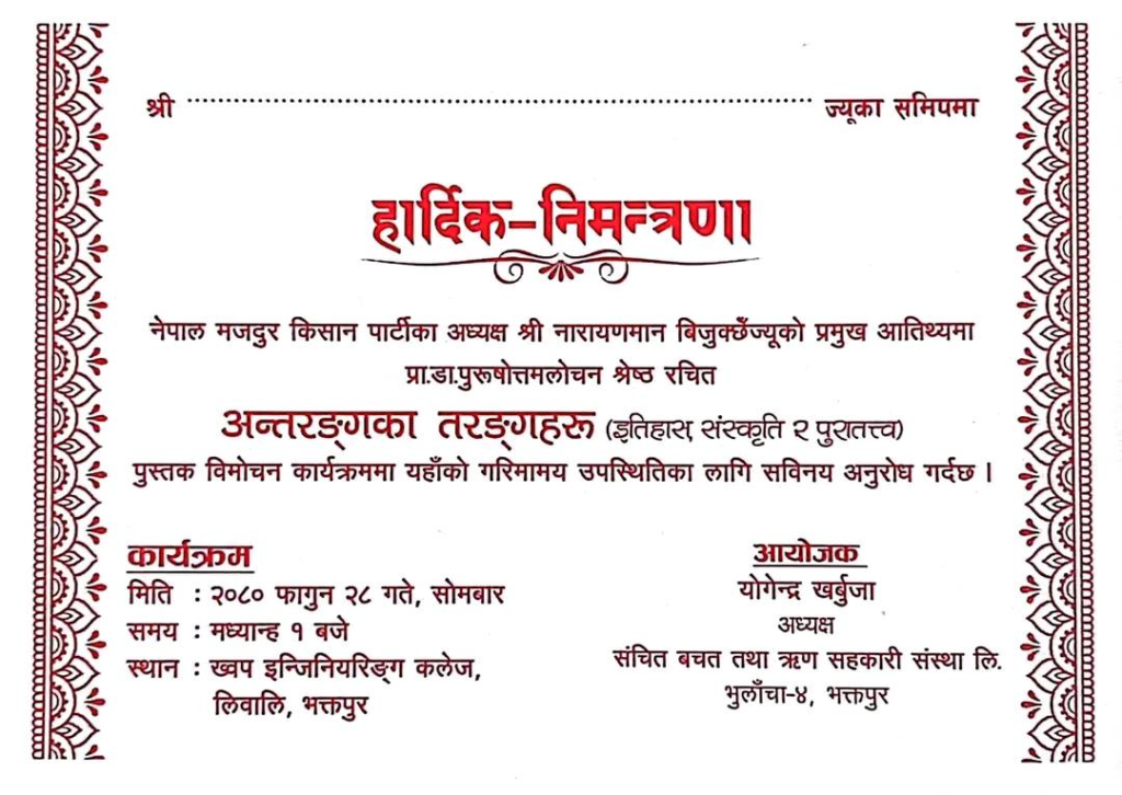 उक्त पुस्तकको विमोचन नेपाल मजदुर किसान पार्टीका अध्यक्ष श्री नारायणमान बिजुक्छेज्यूको प्रमुख आतिथ्यमा हुने आयोजक समितिले जनाइएको छ ।