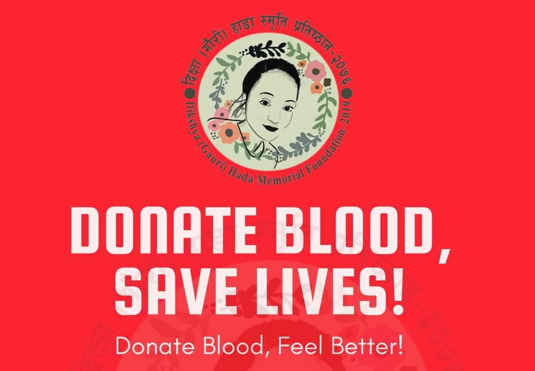 चैत २, भक्तपुर । दिक्षा(गौरी) हाडा स्मृति प्रतिष्ठान नेपालको आयोजनामा इटाछे टोलमा वृहत रक्तदान कार्यक्रम हुने भएको छ । भक्तपुर नगरपालिका वडा न २ स्थित इताछे टोलमा चैत ३ गते बिहान ८ बजेदेखि ११ बजेसम्म खुल्ला रक्तदान कार्यक्रम हुने प्रतिष्ठानले जनाएको छ ।