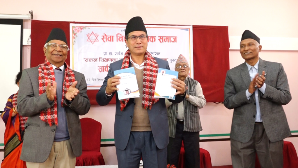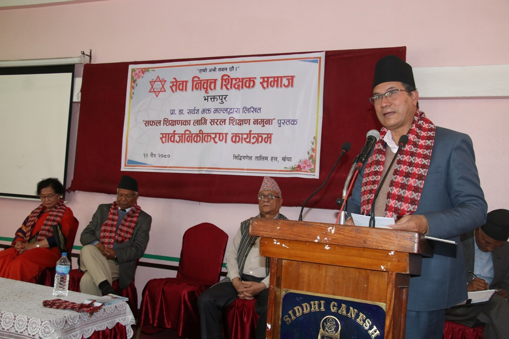 चैत्र १२, भक्तपुर । भक्तपुर नगरपालिकाका प्रमुख सुनिल प्रजापतिले सेवा निवृत्त शिक्षक समाज भक्तपुरद्वारा प्रकाशित प्रा.डा. सर्वज्ञभक्त मल्लको ‘सफल शिक्षणका लागि सरल शिक्षण नमूना’ पुस्तक (दोस्रो संस्करण) को आज एक कार्यक्रमबीच सार्वजनिक गर्नुभयो ।