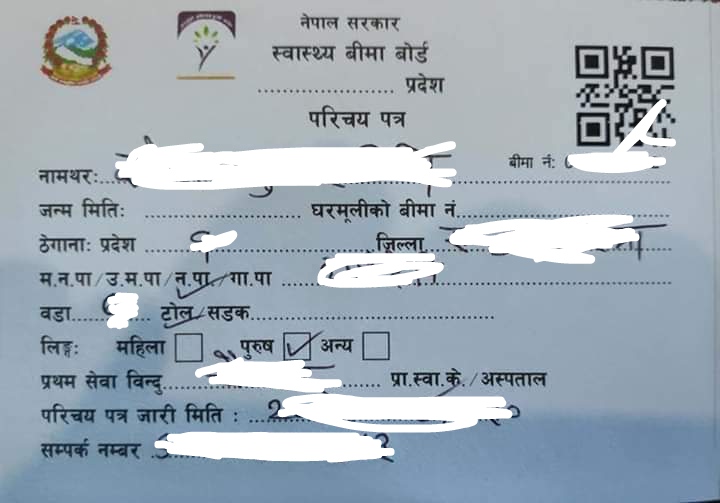 स्वास्थ्य बीमा दर्ता गर्ने बेलामै सम्वन्धित परिवारको सम्पुर्ण बीमित सदस्यहरुलाई क्युआर कोड सहितको छुट्टाछुट्टै स्वास्थ्य बीमा कार्ड प्रदान गरिन्छ।
