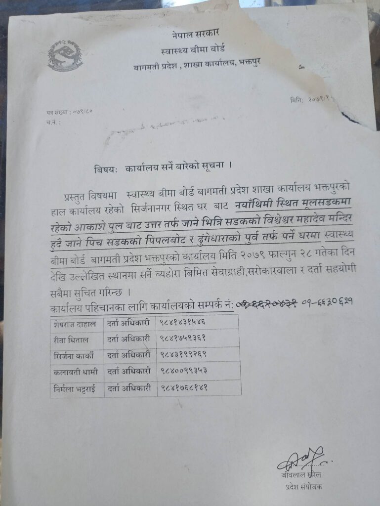 स्वास्थ्य बीमा बोर्ड बागमती प्रदेश शाखा कार्यालय भक्तपुरको हाल कार्यालय रहेको सिर्जनानगर स्थित घर बाट नयाँथिमी स्थित मूलसडकमा रहेको आकाशे पुल बाट उत्तर तर्फ जाने भित्रि सडकको विश्वेश्वर महादेव मन्दिर हुदै जाने पिच सडकको पिपलबोट र ढुंगेधाराको पुर्व तर्फ पर्ने घरमा स्वास्थ्य बीमा बोर्ड बागमती प्रदेश भक्तपुरको कार्यालय मिति २०७९ फाल्गुन २८ गतेका दिन देखि सरेको छ ।