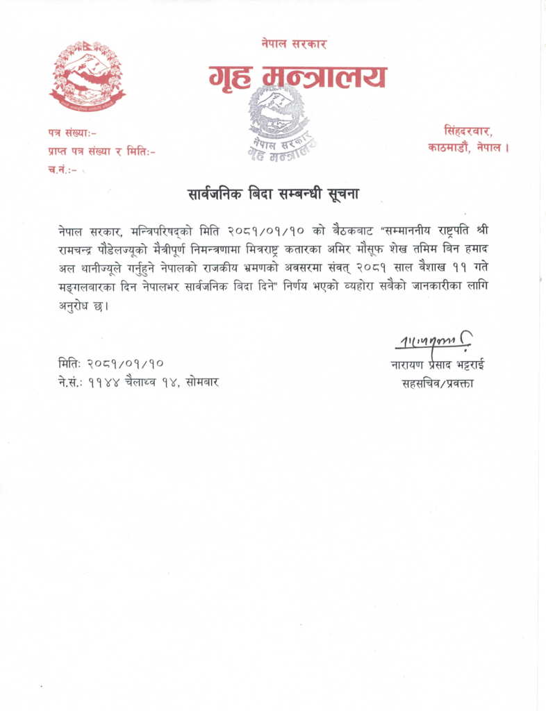 सरकारले भोलि सार्वजनिक विदा दिने भएको छ। कतारका अमिरले भोलि वैशाख ११ गतेदेखि नेपालको राजकीय भ्रमण गर्ने भएकाले सरकारले भोलि सार्वजनिक विदा दिने निर्णय गरेको हो।