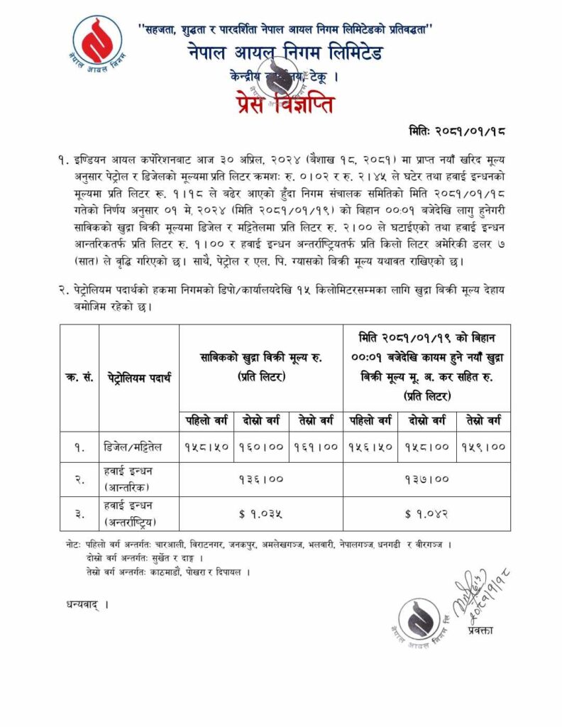 निगमले हवाई इन्धनमा भने मूल्यवृद्धि भएको छ । पेट्रोल र एलपी ग्यासको मूल्य यथावत राखिएको निगमले जनाएको छ ।
