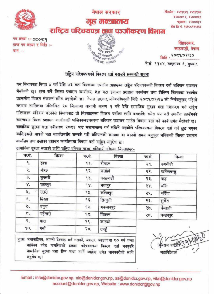 भक्तपुर , जेठ ३२ । नेपाल सरकार, मन्त्रिपरिषद्को मिति २०८१/०२/२४ को निर्णयानुसार पहिलो चरणमा २८ जिल्लामा आगामी श्रावण १ गते देखि सामाजिक सुरक्षा भत्ता नवीकरण गर्न राष्ट्रिय परिचयपत्र अनिवार्य गरेको छ ।