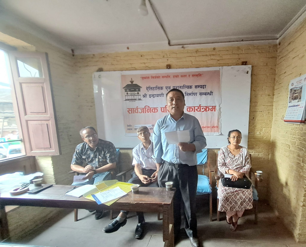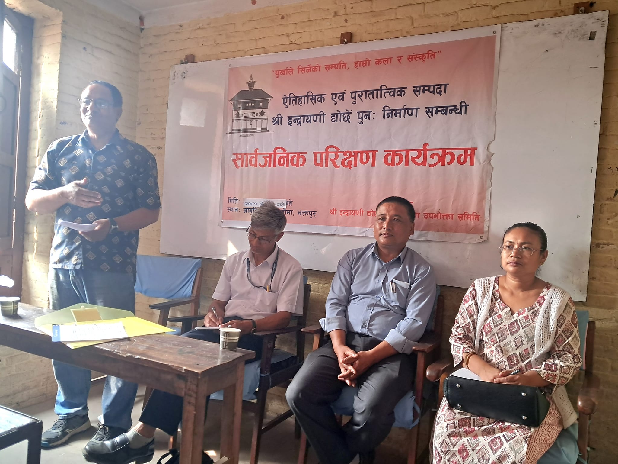 भक्तपुर नगरपालिका वडा नं २ खौमा स्थित ऐतिहासिक एवं पुरातात्विक सम्पदा श्री इन्दायणी मन्दिरको द्योछें पुनः निर्माण सम्बन्धी आर्थिक-विवरण सार्वजनिक परिक्षण कार्यक्रम सम्पन्न भयो ।