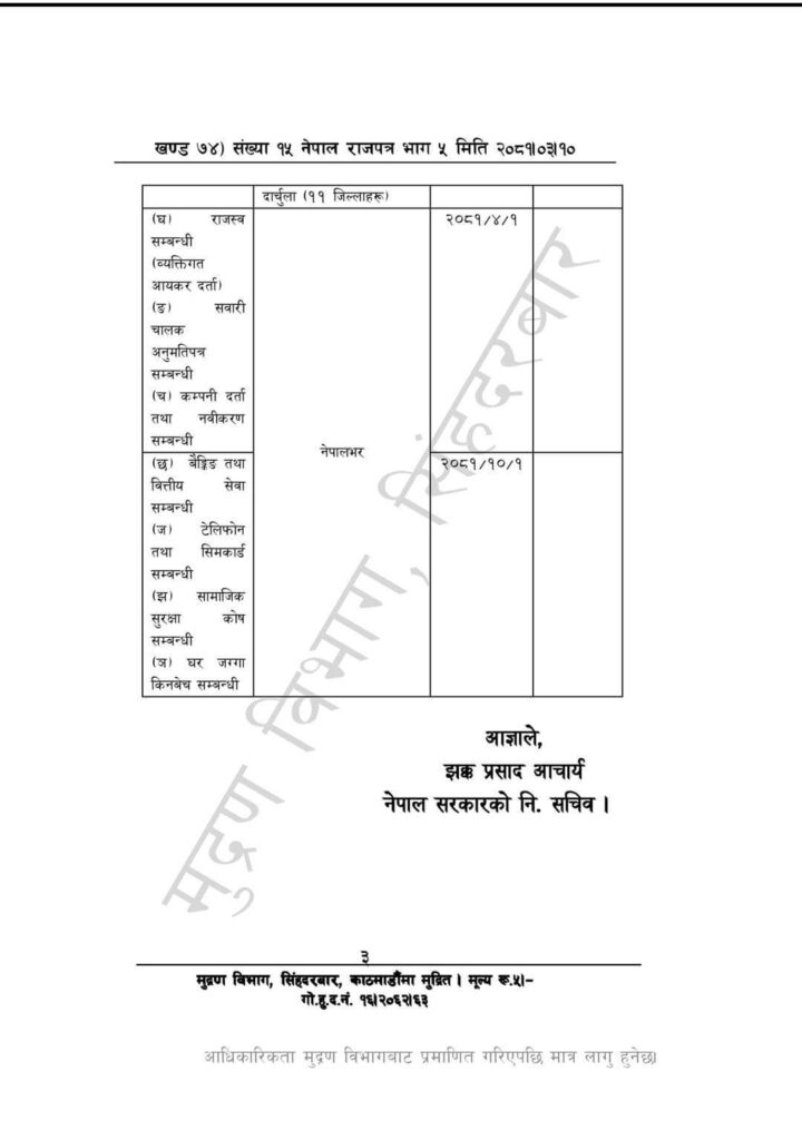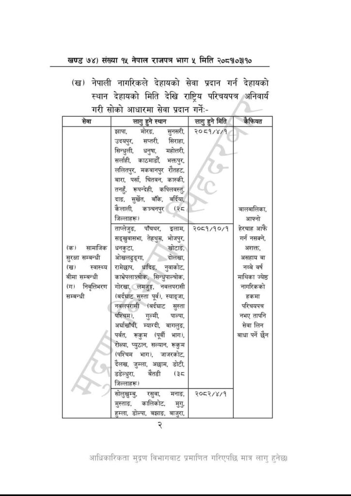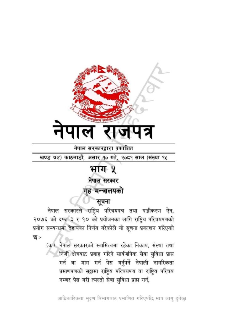 नेपाल सरकारले राजपत्रमा प्रकाशित गरी सामाजिक सुरक्षा भत्ता र स्वास्थ्य बीमा, लाइसेन्स, कम्पनी दर्ता, आयकर, कम्पनी दर्ता र नवीकरण तथा घरजग्गा कारोबार, बैकिङ तथा वित्तीय सेवामा राष्ट्रिय परिचयपत्र अनिवार्य लागू गर्ने उल्लेख छ ।