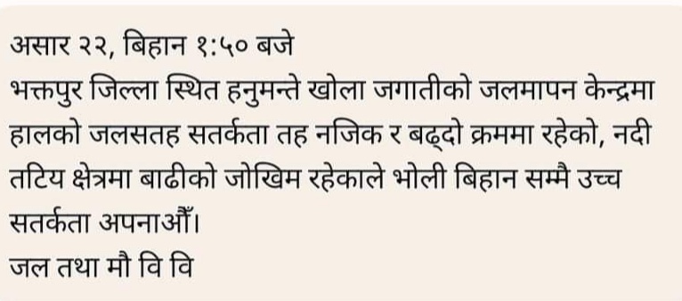 असार २२, बिहान १:५० बजे गते मेसेज मार्फत सर्वसाधारण जनतालाई नदी तटिय क्षेत्रमा बाढीको जोखिम रहेकाले बिहान सम्मै उच्च सतर्कता अपनाउन अनुरोध गरेको छ ।