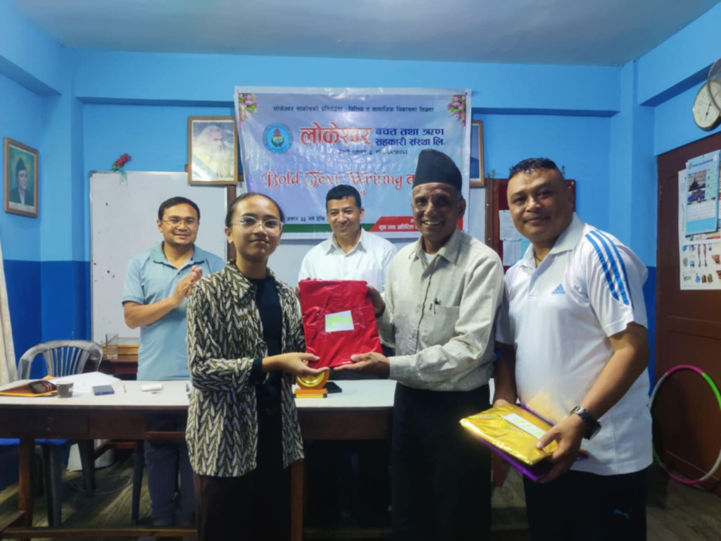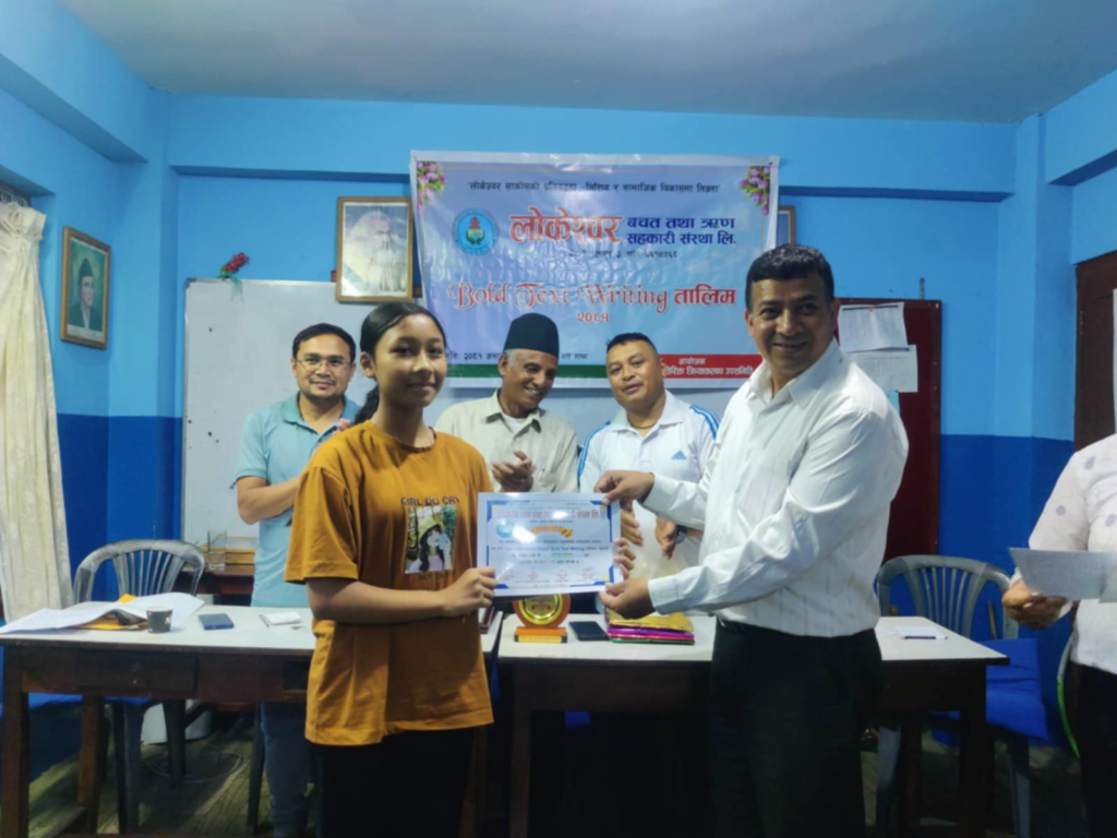 भक्तपुर, असार ३० । लोकेश्वर बचत तथा ऋण सहकारी संस्था लि.को युवा तथा अतिरिक्त क्रियाकलाप उप-समितिको आयोजनामा भएको एक हप्ते Bold Text Writing तालिमको समापन कार्यक्रम भनपा साविक वडा नं. १५ का पुर्व वडाअध्यक्ष्ँ रविन्द्र खर्बुजाको प्रमुख आतिथ्यतामा सम्पन्न भयो ।