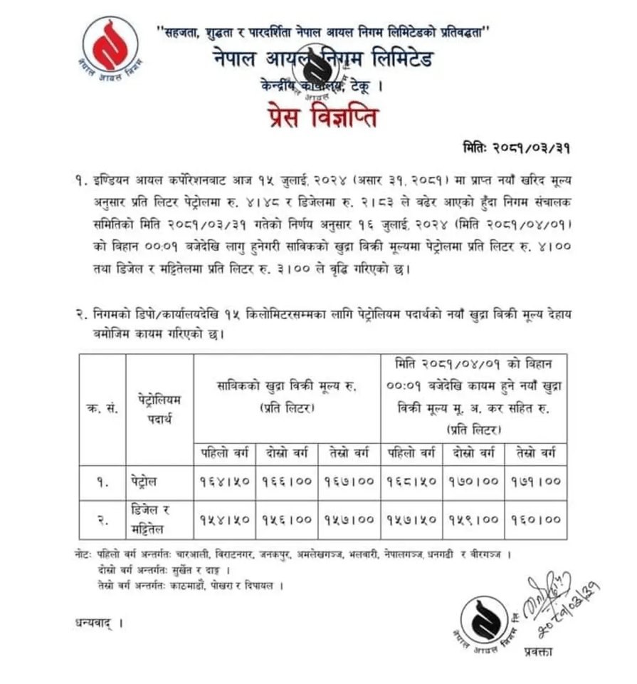 काठमाडौँ, असार ३१। नेपाल आयल निगमले पेट्रोलियम पदार्थको मूल्य बढाएको छ । निगमले पेट्रोलको प्रतिलिटर ४ र डिजेलको ३ रुपैयाँ बढाएको हो । निगम सञ्चालक समितिको सोमबार बसेको बैठकले पेट्रोलियम पदार्थको मूल्य बढाउने निर्णय गरेको निगमले जनाएको छ । आज राति १ बजेदेखि सो मूल्य लागू हुने पनि निगमले जनाएको छ ।