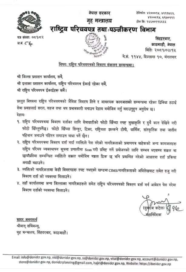 यसअघि सिन्दूर पोते र टिका समेत हटाएर फोटो खिच्न लगाइएको भन्दै तिव्र रुपमा आलोचना भएको थियो । पञ्जीकरण विभागले राष्ट्रिय परिचयपत्रको जैविक विवरण लिने र आवश्यक कागजातको सम्बन्धमा रहेका द्विविधा हटाई सेवा प्रवाहलाई सरल, सहज तथा थप प्रभावकारी बनाउन भन्दै सबै जिल्ला प्रशासन कार्यालय, इलाका प्रशासन कार्यालय, राष्ट्रिय परिचयपत्र इकाई रहेका सबै र राष्ट्रिय परिचयपत्र इकाइलाई ४ बुँदे निर्देशनसमेत जारी गरेको छ ।