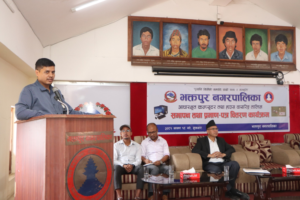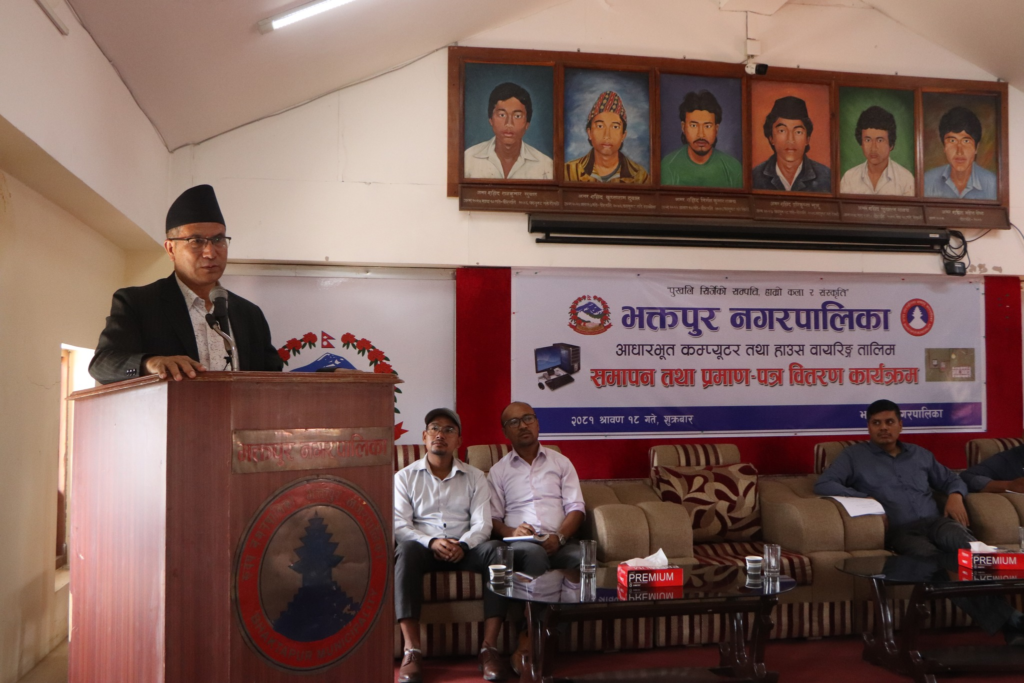 कार्यक्रममा भक्तपुर नपाका प्रमुख प्रशासकीय अधिकृत वसन्त भट्टराइले भक्तपुर नपाले सीपमूलक तालिमहरु सञ्चालन गरी युवाहरुलाई दक्ष बनाउने काम गर्दै आएको बताउँदै आफूमा भएको ज्ञान र सीप देश विकासमा उपयोग गर्न प्रेरित गर्नुभयो ।