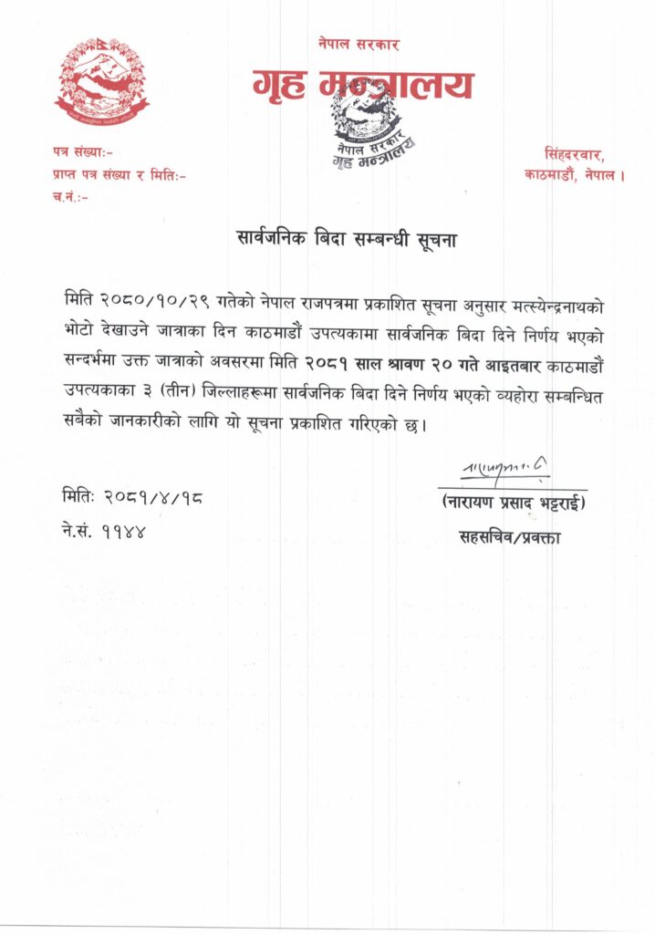 मत्स्येन्द्रनाथको भोटो देखाउने दिन परेकाले सरकारले आज उपत्यकामा सार्वजनिक बिदा दिएको छ ।