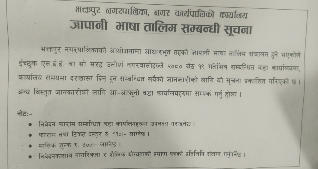 भक्तपुर नगरपालिकाको आयोजनामा आधारभूत तहको जापानी भाषा तालिम संचालन हुने भएको छ । युवा वर्गलाई लक्षित गर्दै हरेक वर्ष नगरपालिकाले तालिम दिदै आइरहेको छ । यस वर्ष ईच्छुक एस.ई.ई. वा सो सरह उतीणर् नगरवासीहरुले २०८० जेठ १९ गतेभित्र सम्बन्धित वडा कार्यालयमा, कार्यालय समयमा दरखास्त दिनु हुन समेत अनुरोध गरिएको छ । निवेदनका साथ नागरिकता र शैक्षिक योग्यताको प्रमाण पत्रको प्रतिलिपि संलग्न गर्नुपर्ने र फाराम तथा टिकट दस्तुर रु. ११०/- तोकेको छ भने मासिक शुल्क रु. ५००/- लाग्ने नगरपालिका स्रोतले जनाएको छ ।