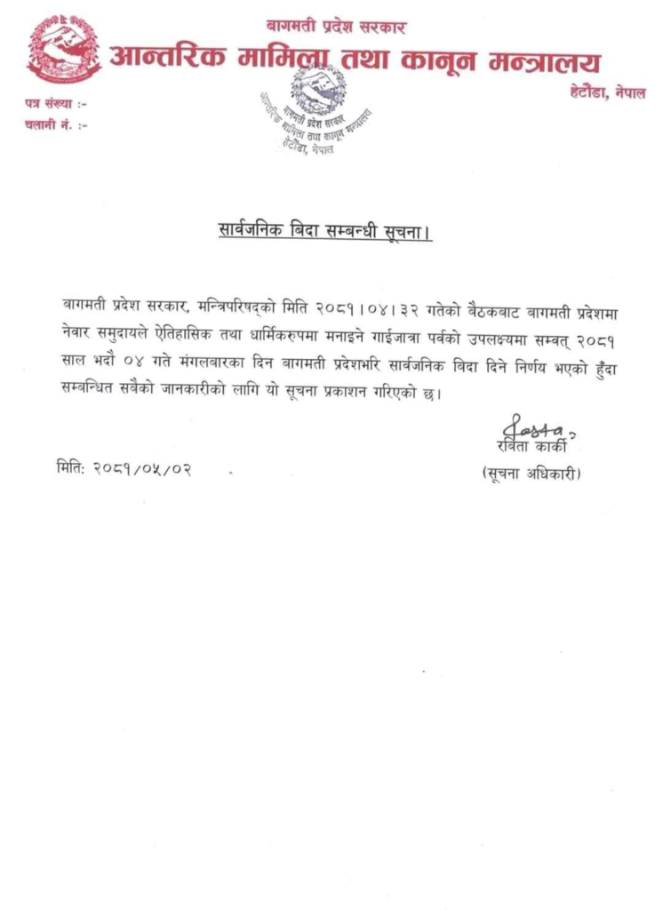 बागमती प्रदेश सरकार, मन्त्रिपरिषद्को मिति २०८१ ।०४ । ३२ गतेको बैठकबाट बागमती प्रदेशमा नेवार समुदायले ऐतिहासिक तथा धार्मिकरुपमा मनाइने गाईजात्रा पर्वको उपलक्ष्यमा सार्वजनिक विदा दिएको छ । यहीँ भदौ ४ गते मंगलबारका दिन बागमती प्रदेशभरि सार्वजनिक बिदा दिने निर्णय भएको सूचना अधिकारी रबिता कार्कीले जानकारी दिनुभएको छ ।