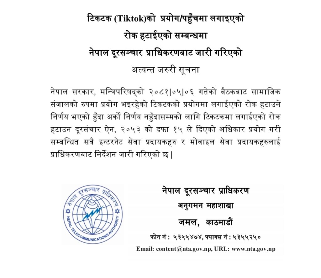 नेपाल सरकार, मन्त्रिपरिषद्को २०८१/०५/०६ गतेको बैठकबाट सामाजिक संजालको रुपमा प्रयोग भइरहेको टिकटकको प्रयोगमा लगाईएको रोक हटाउने निर्णय भएको नेपाल दूरसञ्चार प्राधिकरणबाट जारी सूचनामा उल्लेख छ ।
