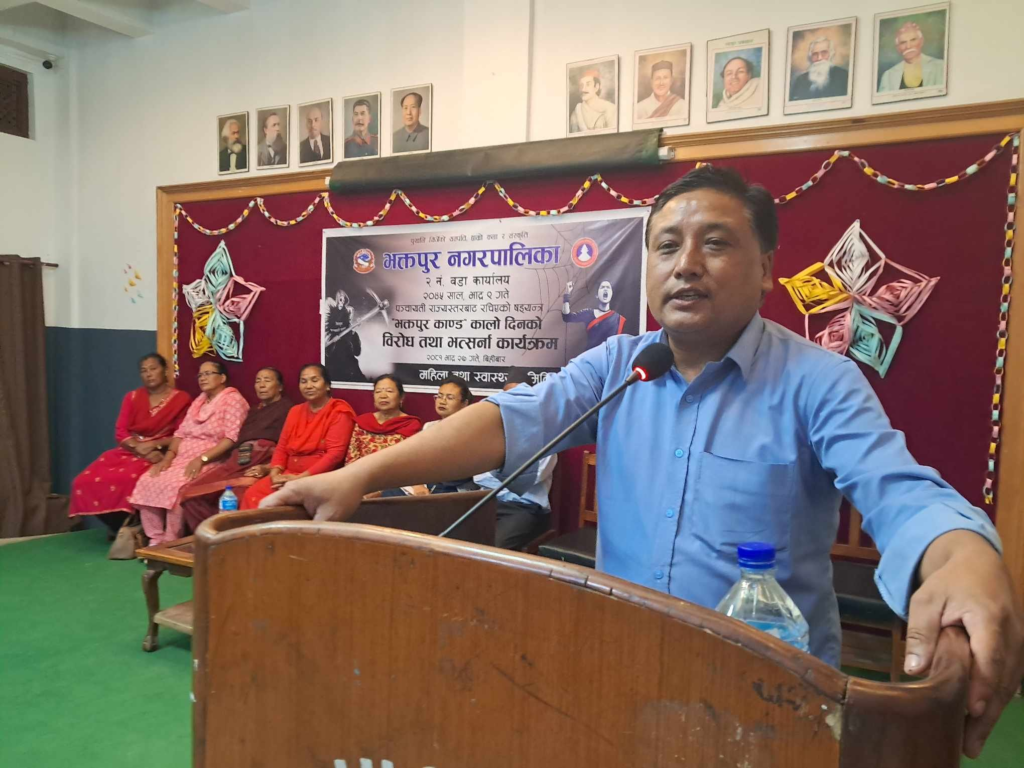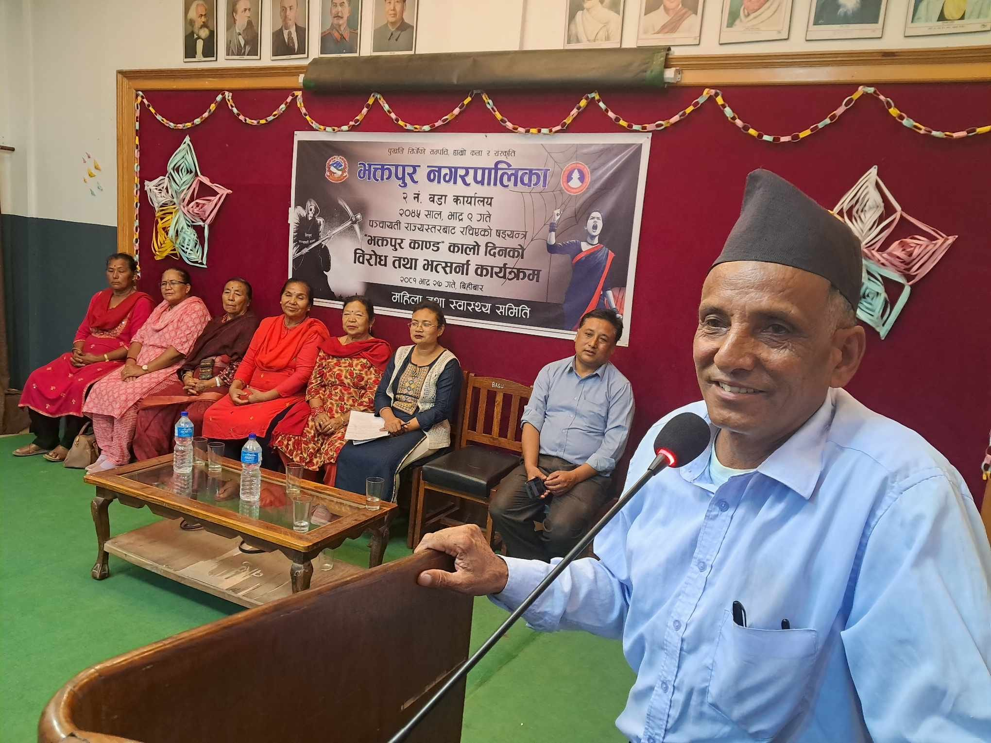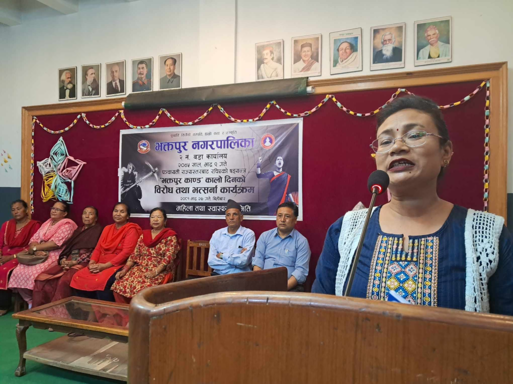 भक्तपुर, भदौ २७ । भ.न.पा वडा नं. २ महिला तथा स्वास्थ्य समितिको आयोजनामा २०४४ साल भाद्र ९ गते पञ्चायती राज्यस्तरबाट रचिएको षडयन्त्र भक्तपुर काण्ड कालो दिनको विरोध तथा भत्सर्ना कार्यक्रम सम्पन्न भयो।