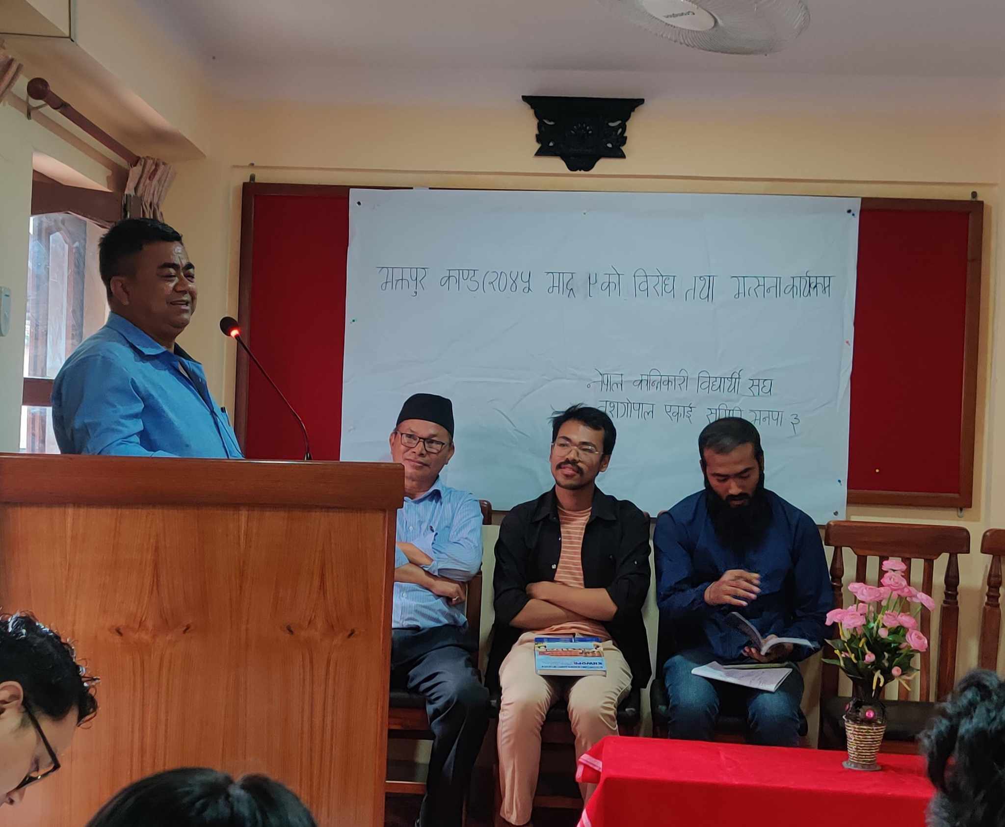 भक्तपुर, भदौ ३० । नेपाल क्रान्तिकारी विद्यार्थी संघ, वंशगोपाल एकाई समिति भनपा – ३ को आयोजनामा पञ्चायती राज्यस्तरबाट रचिएको षडयन्त्र भक्तपुर काण्ड (भाद्र ९) को विरोध तथा भत्सर्ना कार्यक्रम सम्पन्न भयो ।
