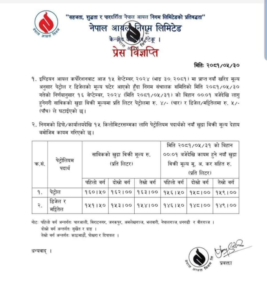२०८१ भदौ ३१ गते बिहान १ बजेदेखि लागू हुनेगरी निगमले पेट्रोलमा प्रतिलिटर ४ रुपैया, डिजेल र मट्टितेलमा समान प्रतिलिटर ५ रुपैयाँले भाउ घटाएको हो ।